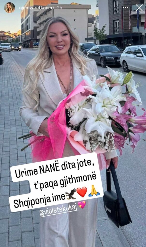 Në profilin e saj në Instagram, Njomza ka publikuar një fotografi të Violetës, ku ajo shfaqet me një buqetë të bukur lulesh në duar, e rrezatuar dhe e qeshur.