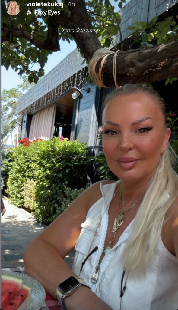 Ajo ka publikuar një foto nga një taverne, ku shihet e veshur me një këmishë të bardhë dhe me aksesorë të artë, por ajo që bie më shumë në sy është grimi i rëndë që ka realizuar për këtë paraqitje, raporton ORAinfo.