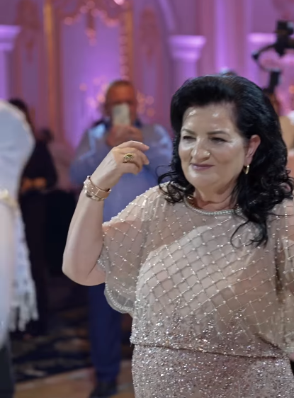 Në sfondin e një salle elegante të ndriçuar me dritat vjollcë e dekorime madhështore, vjehrra shihet teksa ndodhet në mesin e festës, me një dorë në flokë dhe tjetrën në lëvizje – ndoshta duke hedhur një valle tradicionale apo duke përshëndetur të afërmit.