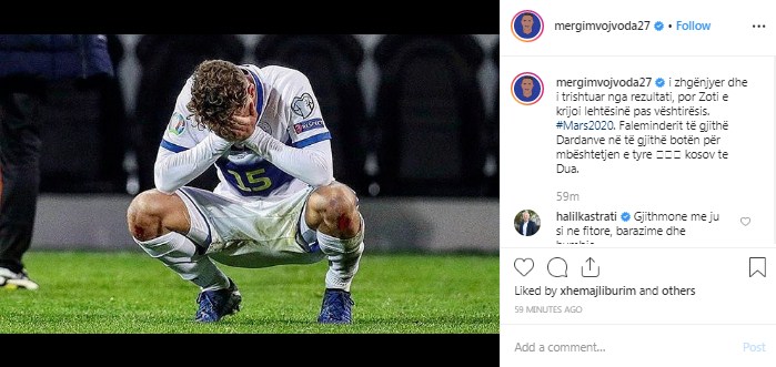 Pas ndeshjes, ai ka postuar një fotografi në profilin e tij zyrtar në Instagram me mbishkrimin emocionues: ” I zhgënjyer dhe i trishtuar nga rezultati, por Zoti e krijoi lehtësinë pas vështirësis. #Mars2020. Faleminderit të gjithë “Dardanëve” në të gjithë botën për mbështetjen e tyre. Kosovë të dua!” – ishin fjalët e mbrojtësit të Standard Lieges.