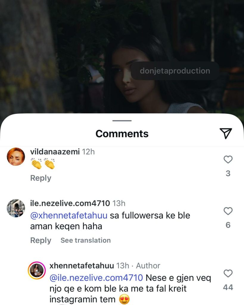 Një ndjekëse e ka akuzuar atë për blejren e “ndjekësve” në Instagram, gjë për të cilën ka reaguar edhe vetë Xheneta.