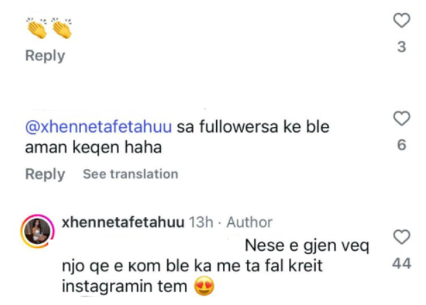 “Sa ndjekës i ke blerë?”, ishte komenti provokues që i është lënë në një nga postimet e saj, duke ngjallur menjëherë reagimin e Xhenetës.
