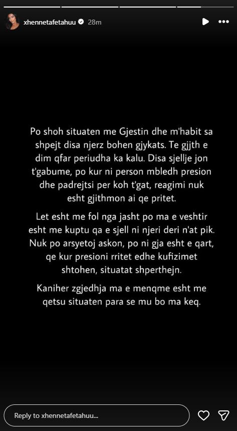 “Disa sjellje janë të gabuara, por kur një person mbledh presion dhe padrejtësi për kohë të gjatë, reagimi nuk është gjithmonë ai që pritet”, ka shkruar Xheneta.