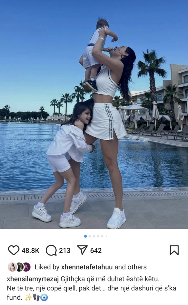 “Gjithçka që më duhet është këtu. Ne të tre, një copë qiell, pak det dhe një dashuri që s’ka fund”, ka shkruar Xhensila.