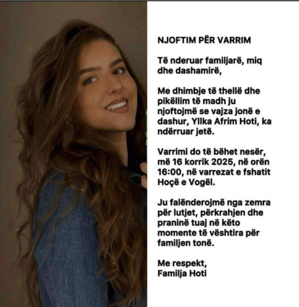 Bëhet fjalë për Yllka Hotin. Vdekjen e saj e ka konfirmuar familja, e cila ka njoftuar për ceremoninë e varrimit.