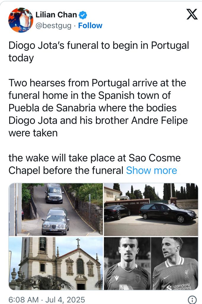 Detajet e funeralit të Diogo Jotas janë zbuluar pas vdekjes tragjike të sulmuesit të Liverpoolit dhe vëllait të tij, Andre Silva, në një aksident rrugor në orët e para të mëngjesit të së enjtes.